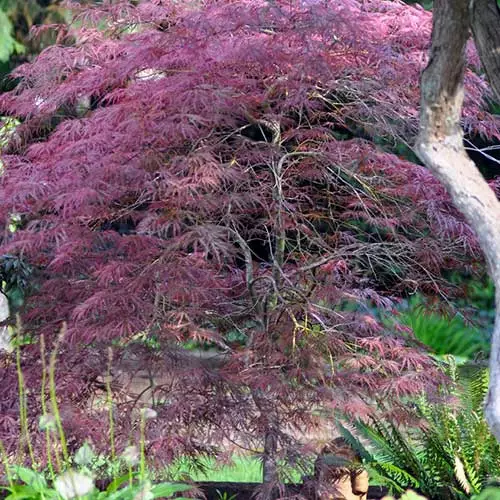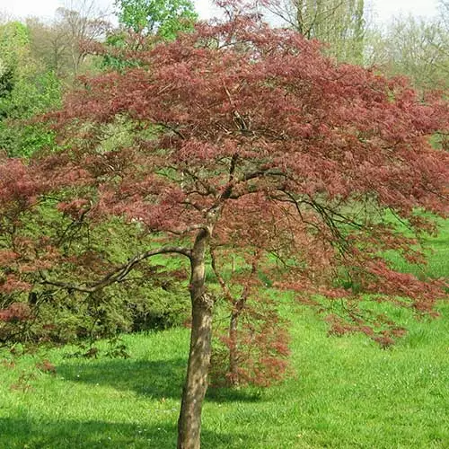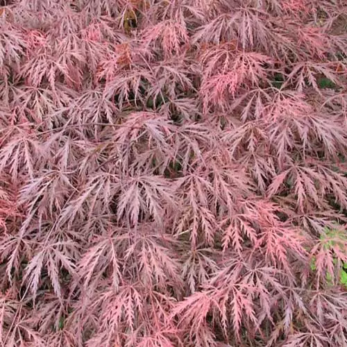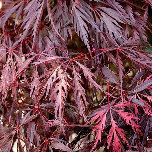 Grown for its attractive shape and elegant, feathery garnet-coloured foliage, Acer palmatum Garnet is a small, slow-growing, deciduous tree (sometimes a medium-sized shrub) with a spreading, mounded habit, perfect as a specimen in the smaller garden. The leaves are beautifully dissected, holding their rich, brownish-red colour through spring and summer, and turn scarlet in autumn. In spring, small, rather insignificant, purplish flowers are followed by red fruits in autumn. Japanese maple Garnet can be grown in a large container in soil-based ericaceous compost, and is particularly beautiful planted where it can be reflected in a small pool. Do not allow the soil to dry out; give a thick mulch in spring. Japanese maple Garnet holds the RHS Award of Garden Merit.