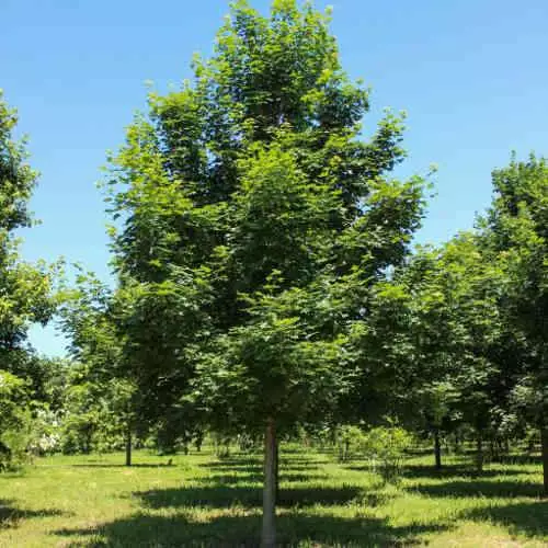 An ornamental hybrid maple grown for its shapely form and wonderful autumn colour, Acer truncatum x A. platanoides Keith’s Form (Norwegian Sunset ®) is a medium-sized, fairly fast-growing, deciduous tree with a well-branched habit, oval and upright when young, but broadening with age to a domed form. Glossy, slightly leathery leaves have the typical five-pointed maple shape, emerging with a purplish flush, they turn deep green in summer and brilliant shades of yellow-orange and red in autumn. Maple Norwegian Sunset ® makes a good specimen tree, good on windy sites and in smaller gardens, and tolerant of urban pollution.