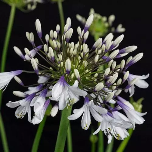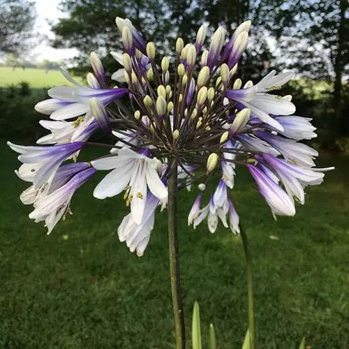 An award-winning bi-coloured agapanthus or African lily, Agapanthus Fireworks is a compact, evergreen perennial, very striking ranged along the front of a border, or grown in containers; agapanthus do very well in pots, as they flower best with their roots congested. The strap-shaped, evergreen leaves are rich green. In July and August, very big round heads of trumpet-shaped flowers with pure white tips and deep blue bases rise above the clump on strong stems; the flowers are attractive to pollinators. In colder, more exposed areas, provide winter protection, removing any damaged leaves in spring, or keep the plants in pots and bring them in for the winter. Agapanthus Fireworks holds the RHS Award of Garden Merit.