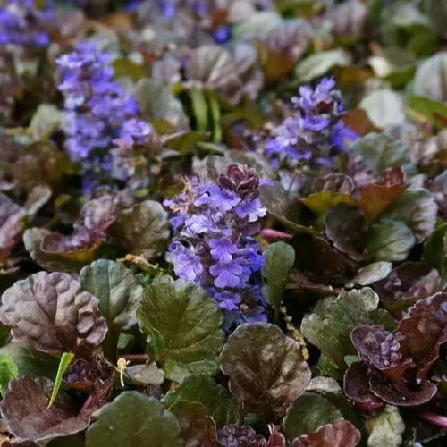 A low growing spreading perennial perfect for carpet forming groundcover over banks and slopes, Ajuga reptans Black Scallop is an easy care, hardy evergreen that will establish almost anywhere providing there is moist soil. Dislikes dry shade. The glossy ‘black’ scalloped leaves are actually deeply dark purple with hues of bronze and green if planted in the shade- the more sun this plant gets, the darker the leaves. This variety is a little later to flower than others, producing short flower spikes of deep blue nettle like flowers in late Spring to early Summer which are very attractive to bees and other beneficial pollinating insects. Generally resistant to grazing deer and rabbits. Bugle Black Scallop offers exceptional contrast at the front of the border and in containers all year round.