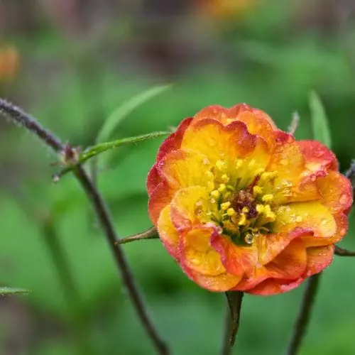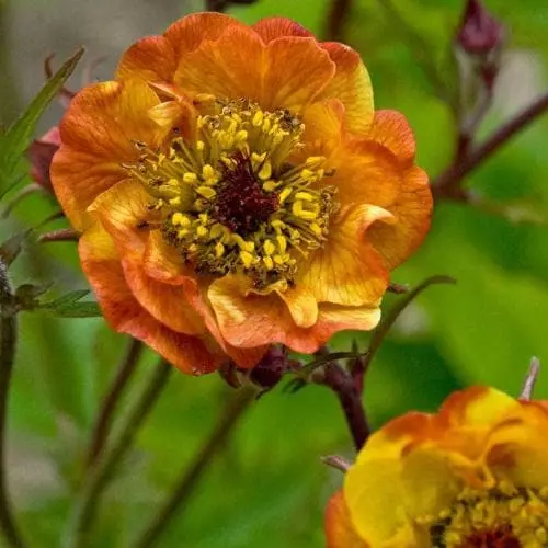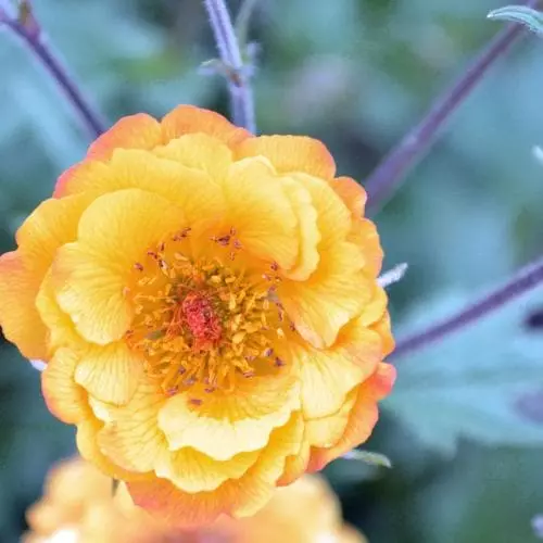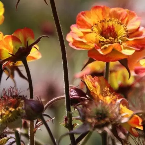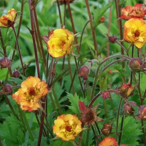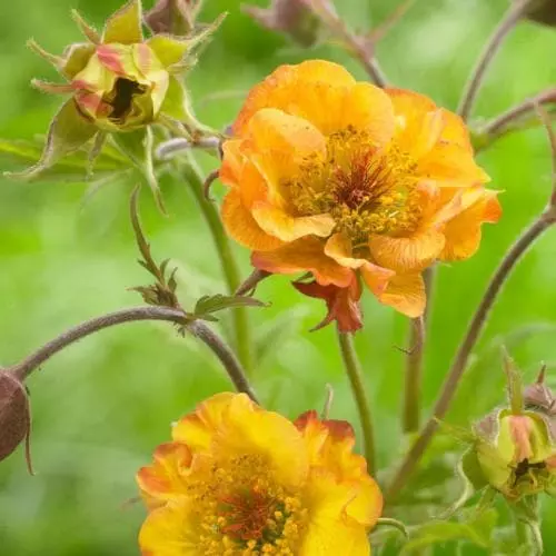 A new hybrid avens cultivar, Geum Alabama Slammer is a fast-growing, semi-evergreen, clump-forming, herbaceous perennial, ideal for the front of a border. Glossy, light green, round  leaves form a low mound, from which rise slender, branching burgundy flower-stems. The flowers are semi-double, ruffled, and a golden orange, shaded in red, and appear as dots of colour floating above the leaves; they appear in late spring and early summer. Cut back after flowering for fresh leaves and more flowers. Avens Alabama Slammer spreads slowly by rhizomes, and should be divided every two to three years, to keep the plant from becoming woody and bare in the centre. Lovely with low, bronze grasses or dark tulips, it’s an easy, slug-resistant, trouble-free plant.