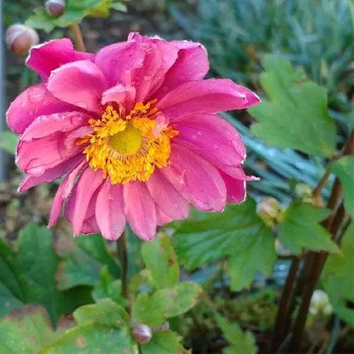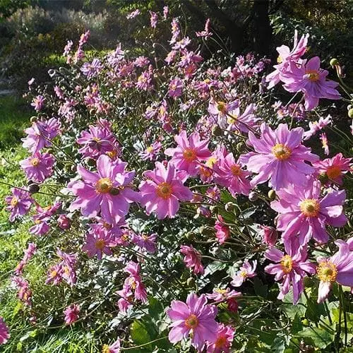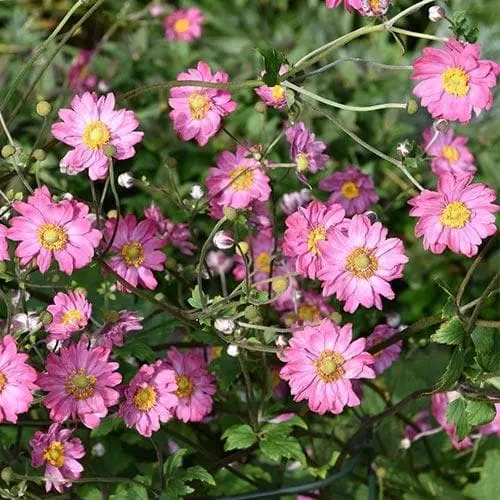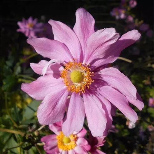 A fairly new cultivar of Japanese anemone, Anemone hupehensis var. japonica Pamina is a lovely, long-flowering herbaceous perennial for the late summer garden. It has a spreading habit, tending to run at the root. The deep green, palmate leaves come up early in the year and, as they grow, are very good at concealing the dying foliage of ornamental alliums, which bloom earlier in the year. In August and September, sometimes into October, beautiful, semi-double, rose-pink flowers, 2”/5cm across, with a ring of golden stamens, rise above the clump on slender, dark stems. The flowers are attractive to pollinators. Japanese anemone Pamina holds the RHS Award of Garden Merit.