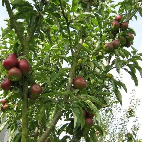 Once widely grown in Meath, Apple Blood of the Boyne may not be an Irish heritage apple, as it is thought to be identical to Devonshire Quarrenden, an old apple from the English west country. An early dessert apple, the fruit is small, round and a vivid purplish blood-colour. This is an apple to be eaten fresh from the tree. The flesh is soft, sweet and white, sometimes tinged pink, with a taste of strawberries. A very attractive tree when in fruit. Tendency to biennial bearing, so be sure to thin the developing fruit.