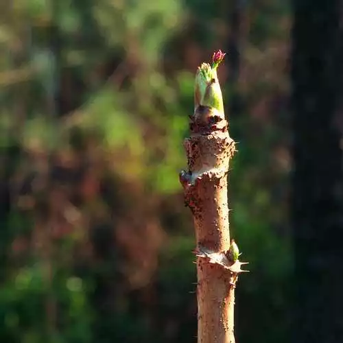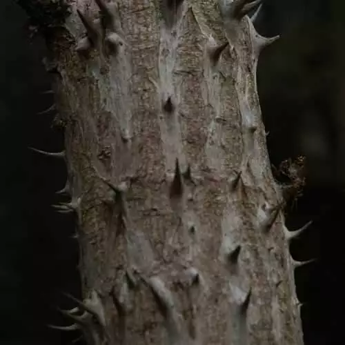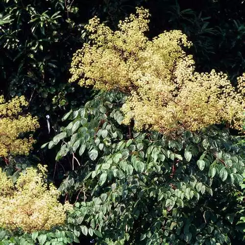 Also known as the angelica tree, deciduous Aralia spinosa gets its unusual common name from the gnarled, spiny appearance of the stems when it is not in leaf. Originally from North America, it is fast-growing and umbrella-like in habit. Its tall, spreading stems bear huge, prickly, heavily divided leaves, up to 3ft (90cm) long, at their tips, giving an exotic, palm-like appearance. The leaves colour well in autumn, turning reddish bronze in good conditions. Large panicles of lacy, creamy-white flowers in July are followed by purplish-black berries in autumn. A really striking, if very prickly specimen plant. Tolerant of salt, but the leaves may be damaged by high winds.
