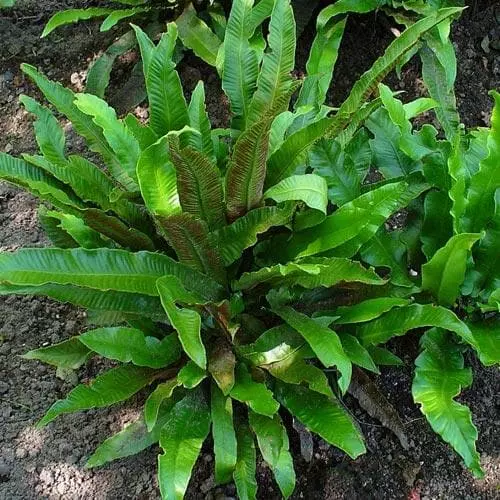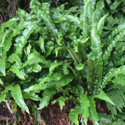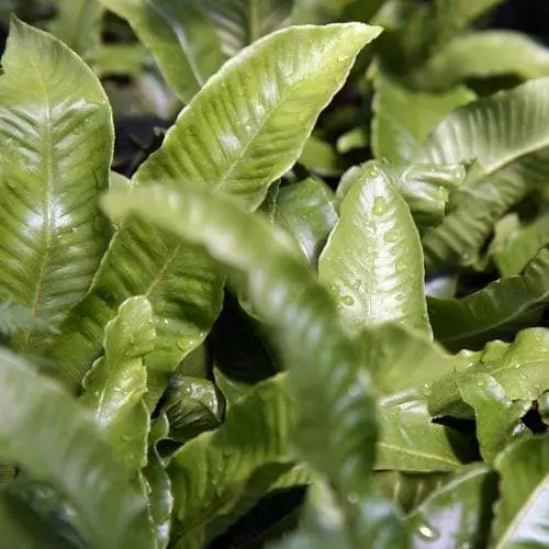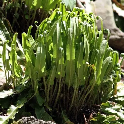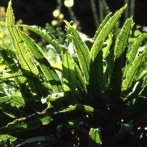 A native Irish fern, Asplenium scolopendrium is a small, rich green, hardy, clump-forming evergreen fern with broad strap-like leaves with wavy edges, a vivid contrast to lacier ferns. It is often seen at the foot of stone walls – it likes the lime from the mortar, although it will tolerate most well-drained soils, even dry ones once it’s established. Hart’s tongue fern is a very useful plant for deep shade, where its brilliant green makes a bright patch in the gloom, retaining its fresh appearance all year. Holds the RHS Award of Garden Merit.