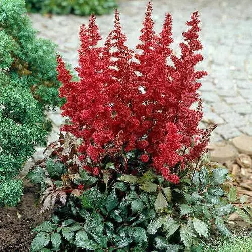 One of the best astilbe cultivars, Astilbe Fanal is an upright, clump-forming, herbaceous perennial, whose ferny foliage, borne on dark stems, emerges bronze, later turning green. Feathery spires of deep red flowers, attractive to butterflies and moths, appear above the foliage from June to August. Looks well with box, grasses, smaller hydrangeas, and good underplanted with daffodils, as the growing foliage hides the daffodils’ dying leaves. Astilbe Fanal holds the RHS Award of Garden Merit.