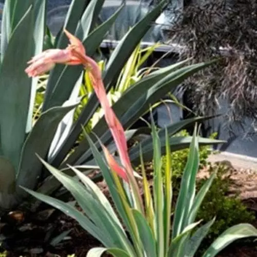 Only for the mildest areas, planted in the shelter of a warm wall, Beschorneria yuccoides Flamingo Glow is an exotic-looking perennial plant with rosettes of lance-shaped, yucca-like leaves, variegated in longitudinal stripes of yellow and grey green. In midsummer, mature plants produce bright pink stems up to 5’/1.5m tall with lime-green flowers within long carmine bracts. In colder areas, Beschorneria Flamingo Glow should be planted in cactus compost in a large container and brought into a frost-free greenhouse for the winter.