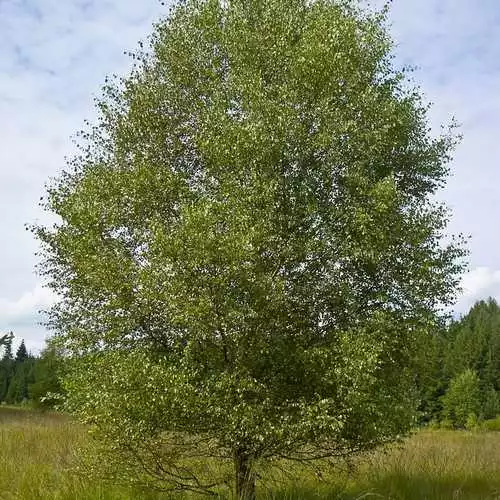 The native species Betula pubescens is a tall, deciduous tree rather similar to the silver birch but with creamy-brown bark rather than white, more upright branches, and fine down on the young twigs. It also prefers damper environments, being found on bogs, and tolerates shadier conditions. Narrowly conical habit. Long greenish-brown male catkins appear as the tree comes into leaf; the female flowers are upright, releasing small winged seeds in autumn. The leaves are triangular and serrated, often downy underneath, light green, turning orange-yellow in autumn. The downy birch often hybridises with the silver birch.