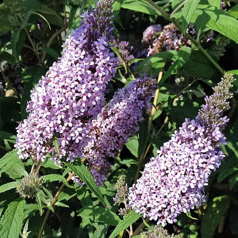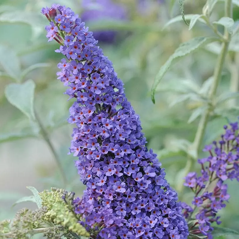 Buddleia is also known as the butterfly bush. Buddleja davidii Buzz Sky Blue is a compact, long-flowering, deciduous shrub, ideal for a patio or a small garden. The narrow elliptical leaves are an attractive grey-green. From June to September, conical heads of bright mauvish-blue flowers with a tiny orange eye are borne in profusion; the flowers are extremely attractive to bees and, especially, to butterflies. Buddleia Buzz Sky Blue is easy to grow, and does well in containers as well as planted at the front of a border. Prune to shape in early spring.