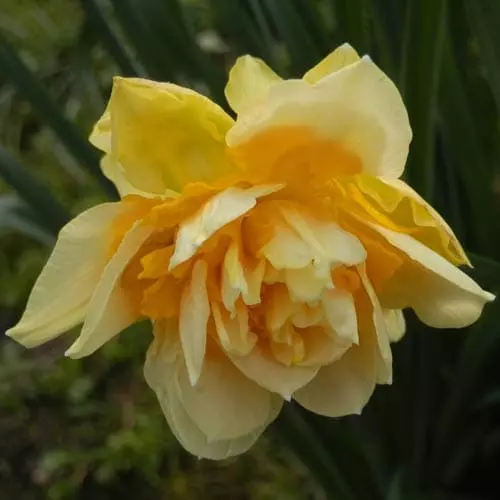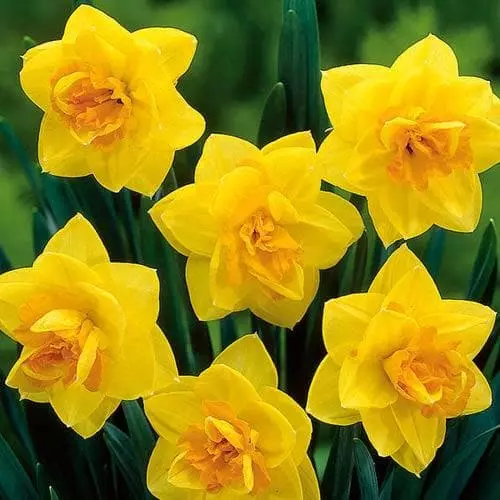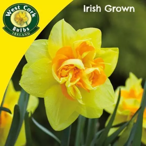 An Irish-grown double daffodil with striking golden yellow and orange flowers. Narcissus Apotheose thrives equally well in container gardens or it will naturalise well in lawns or under trees. Daffodils will grow in sun or partial shade.