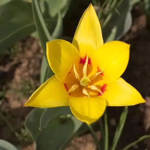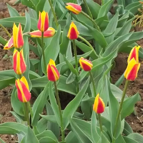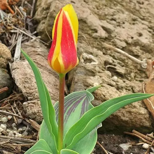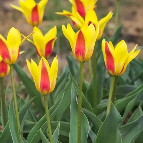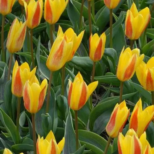 A low growing tulip with yellow flowers flamed red on the outside. Attractive broad blue-green foliage have brownish-purple mottling. Blooming through the month of April. Excellent in containers or borders. From the Kaufmanniana Group of tulips.