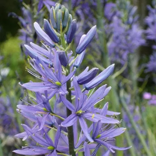 Tall spikes of large violet-blue flowers appear in April & May. Camassia l. Caerulea will form clumps and gradually spread so plant them somewhere they can naturalise happily and be left to die down naturally after they flower. As Camassia is a tall growing bulb, they will tolerate been planted in wild and grassy areas. Camassia leichtinii (the white form of this plant) can be found in the mountain meadows of north western USA in full sun but they will also do well in part shade. Grow in moist but well-drained, fertile, humus-rich soil with some protection from hard frosts, a layer of mulch will help Camassia to overwinter successfully.