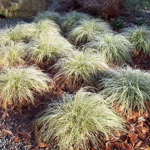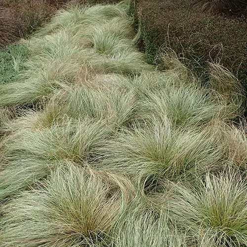 A small, tufted perennial, evergreen sedge, Carex comans Frosted Curls has very slender, elegantly curled silvery-green leaves which curl elegantly over the edge of borders or containers and shimmer in the breeze. Carex Frosted Curls is a very useful, low-maintenance, garden plant, contrasting beautifully with flowers, against gravel or reflected in pools. Tiny green flowers self-seed mildly, so the short-lived parent plant can be replaced.