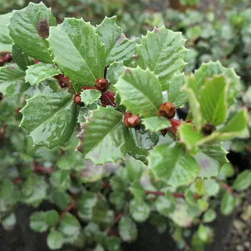 An unusual but attractive California lilac for very mild and seaside gardens, Ceanothus gloriosus var exaltatus Emily Brown is a very low, evergreen shrub with a dense, prostrate, mat-forming habit. Reddish-brown stems carry small, oblong to ovate, rather holly-like, deep green leaves. In May and June, the shrub bears dense, rounded clusters of deep blue to violet-blue flowers, 1”/2.5cm across. California lilac Emily Brown makes good ground-cover, but it does need a warm, sheltered, frost-free position.