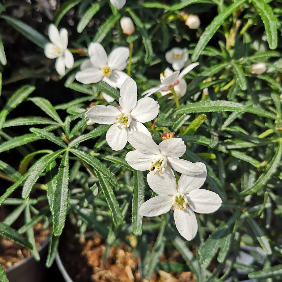 A scented shrub which blooms twice a year, Choisya ternata Gold Star is a medium-sized, fast-growing, evergreen shrub with a rounded habit. The deep green leaves are palmate (narrowly hand-shaped) and aromatic. Corymbs of pale pink to white, starry flowers, scented of orange blossom, appear between March and May, and again in September to October. Mexican Orange Blossom Scented Gem may suffer foliage and stem damage in very severe winters.