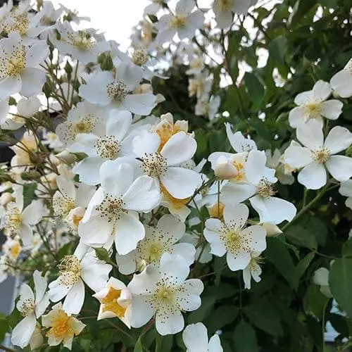 Discovered by and named for the famous plantsman, artist and gardener, Rosa Sir Cedric Morris is a very large, vigorous, thorny, deciduous rose with long, lax stems and beautiful, divided leaves flushed with purplish-grey, a legacy from its Rosa glauca parent. Like most ramblers, it flowers magnificently in midsummer, but does not repeat. Huge clusters of small, single, creamy-white flowers with golden stamens and a gentle scent are borne in midsummer, making a breath-taking spectacle. The flowers, which are attractive to bees, are followed by bright orange-red hips in autumn, giving a second season of interest. Rambler rose Sir Cedric Morris is a tough, hardy rose, particularly good trained over a pergola or up a tree with a late-flowering viticella-type clematis, which will flower when the rose has gone over. Because its stems are lax, it is easy to train.