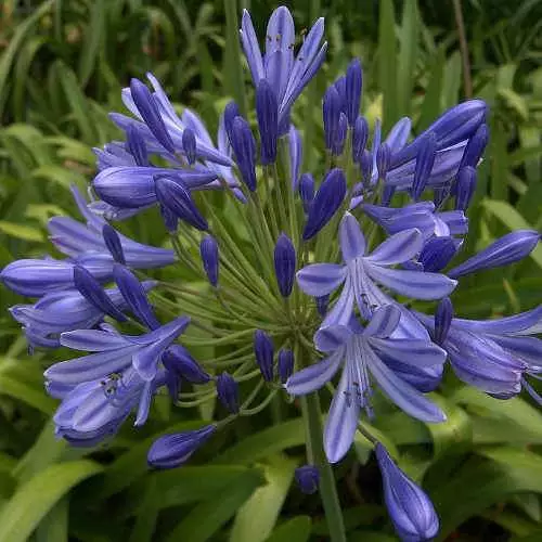 A relatively compact African lily cultivar, Agapanthus Brilliant Blue is a deciduous, clump-forming herbaceous perennial. The original African lilies come from South Africa, but are surprisingly hardy in our climate, the deciduous varieties being slightly hardier; nevertheless, a thick mulch will help them come through the winter in colder areas. The plant forms a clump of strap-shaped, mid-green leaves. From midsummer, rounded heads of wonderfully rich blue flowers with a deeper blue stripe rise on strong stems from the clump of leaves; the flowers are very attractive to bees. African lily Brilliant Blue is a great plant for repeating along the edge of a sunny border.