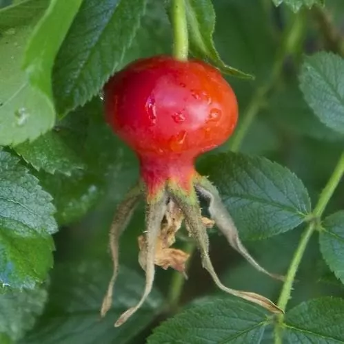 A repeat-flowering rugosa rose bred in Canada, Rosa Jens Munk is a medium-sized, vigorous, deciduous shrub rose with a compact, bushy, suckering habit, and very prickly stems. The divided, leathery leaves have narrow leaflets that are very deeply veined and glossy green, turning yellow in autumn; they are very healthy. From June to August, the shrub bears scented, semi-double, lilac-pink flowers with golden stamens. These are followed by small, round red hips which persist well into autumn. One of the Canadian Explorer series, rose Jens Munk was named after the Norwegian explorer, and, like him, is a really tough, healthy plant. Can be grown as an informal hedge.