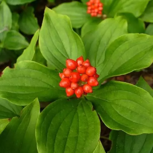 A low, creeping North American woodland, shrubby perennial that makes excellent groundcover in light shade and woodland areas, does best on moist acid soil. Attractive white flowers in June, followed by scarlet red, edible fruits in August.