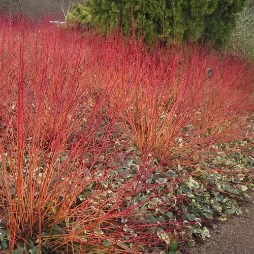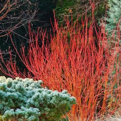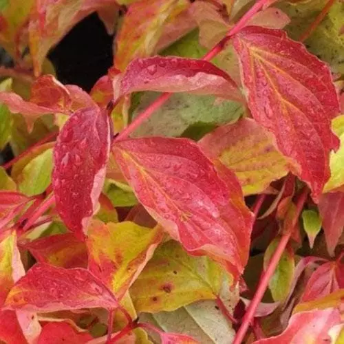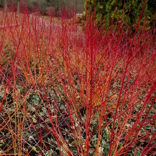 Grown for its wonderful autumn and winter colour, Cornus sanguinea Anny’s Winter Orange is a vigorous, medium-sized, deciduous shrub with a suckering habit and deep orange-red stems in winter and early spring; stems fade to yellow in summer. Soft green leaves turn gorgeous shades of coral, orange, red and yellow in autumn. Inconspicuous white flowers appear in March and April, followed by black berries. An easy, healthy, very tolerant plant. Cut back stems to about 30cm from the base each year to keep the plant compact and the stem colour vivid. One of the best cultivars for vigour and stem colour, Cornus sanguinea Anny’s Winter Orange holds the RHS Award of Garden Merit.