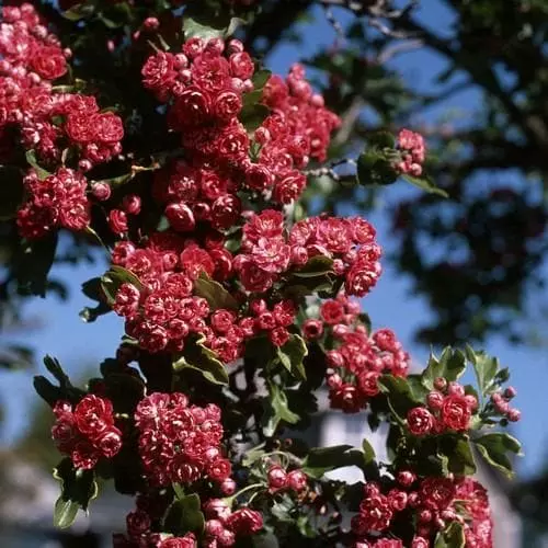 A garden form of the Midlands hawthorn, Crataegus laevigata Crimson Cloud is a small, thorny, deciduous tree with glossy, lobed leaves. Showy clusters of small, deep pink flowers with a white eye appear in late spring, covering the branches. These are followed in early autumn by small, bright red haws, which persist until late autumn. Very hardy. This ornamental hawthorn can also be used as hedging. Holds the RHS Award of Garden Merit under the name Crataegus laevigata Punicea.