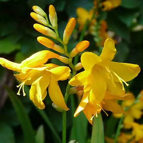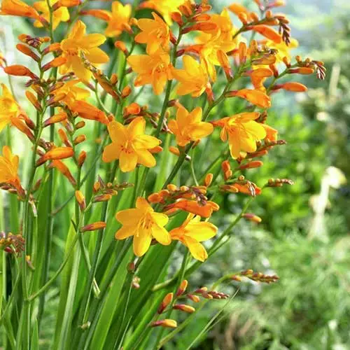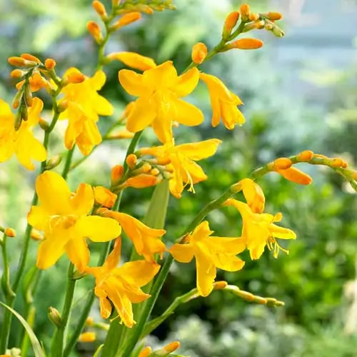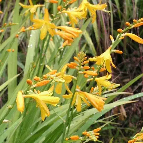 A compact form of crocosmia, suitable for smaller gardens, Crocosmia x crocosmiifolia Buttercup is a herbaceous, cormous perennial with a clump-forming habit. The sword-shaped, mid-green leaves form a dense clump. In the second half of summer, gorgeous, bright yellow, trumpet-shaped flowers rise above the clump on arching, branched, stems. Crocosmia Buttercup is easy to grow, and can be left in place without attention for several years.