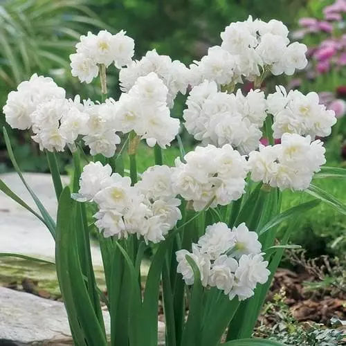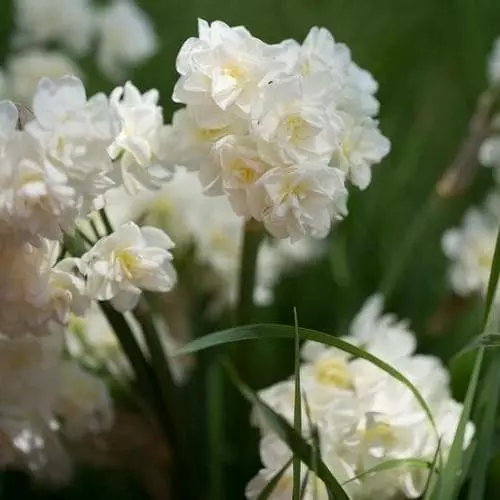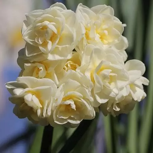 A narcissus variety for forcing indoors, Narcissus Erlicheer is a smallish, bulbous, borderline-hardy, perennial with an upright habit. The leaves are strap-shaped and mid-green. Depending when you plant it, autumn or spring, pretty, double, multi-headed, creamy-white flowers appear from November to March, with a butter-yellow centre and a stunning scent, rather gardenia-like, which will fill the largest room. When the display is over, it can be planted in a warm, sheltered bed outdoors, in very mild areas. Narcissus Erlicheer also makes a fine cut flower. To force, plant in bulb-fibre, wearing gloves, and keep in the dark for eight weeks, before bringing into a shady room, gradually increasing the light.