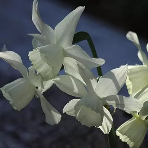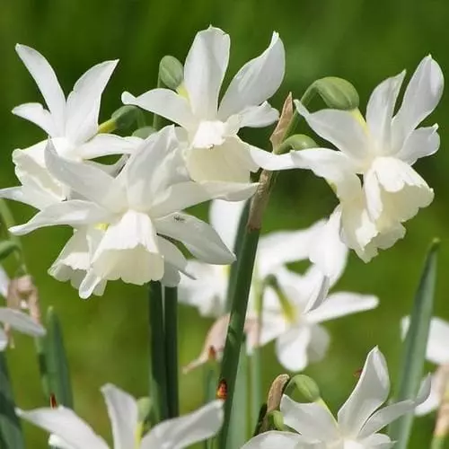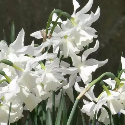 An old, refined and elegant, but reliable daffodil, Narcissus Thalia is a medium-sized, quite fast-growing, bulbous perennial with an upright habit, ideal for the smaller – or indeed any – garden. The leaves are narrow, almost grassy, and mid-green. Long-lasting, scented, multi-headed, flowers emerge from greenish-white buds, turning milk-white with slightly twisted, recurved petals and a delicate ‘trumpet’ in April and into May. As delicate as the flowers look, Daffodil Thalia is actually a toughie; it withstands wind, hail and rain, bulks up well, can be naturalised in grass, and the slender leaves die unobtrusively. Just be careful to plant them in a south-facing bed, as otherwise they will turn towards the sun, like all narcissus/daffodils. It makes a lovely, richly scented, cut flower (don’t mix narcissus with other flowers). Daffodil Thalia is best planted in big clumps or in drifts under deciduous trees, or goes very well with Tulip Spring Green in a zinc container.