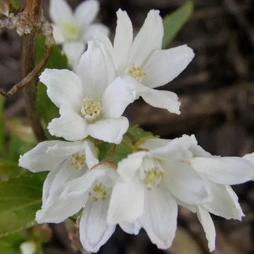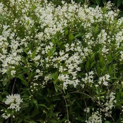 A small deciduous shrub with a low spreading habit, arching branches and green leaves, turning purple-red in autumn. Abundant clusters of star-shaped, pure white flowers appear in late Spring or early Summer. Stems are somewhat short-lived, and annual pruning of dead branches is usually necessary. Prune in spring immediately after flowering.