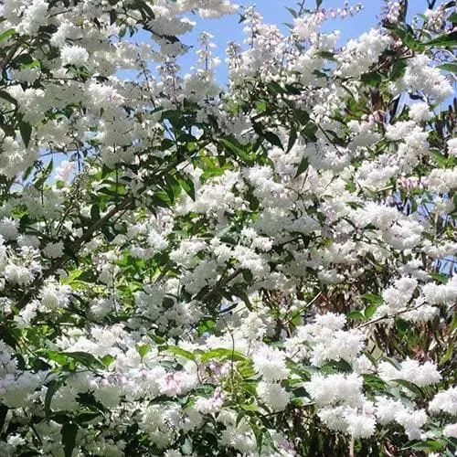 Sometimes known as bridal flower, Deutzia scabra Pride of Rochester is a tall, deciduous shrub with a rounded habit and arching branches, lovely at the back of a border. The pale brown bark peels as the shrub matures, and the ovate leaves, 3”/7.5cm long, are deep green and ‘scabrous’ (fuzzy) – hence the species name. In June and July, the shrub is covered with dense, upright panicles of honey-scented flowers, with rows of white petals, tinged with pink at the base. Deutzia Pride of Rochester is notably resistant to honey fungus, rabbit-resistant, easy to grow, and very attractive to bees and other pollinators.