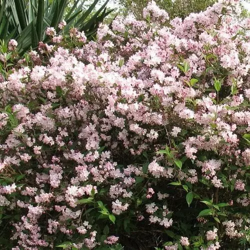 A compact bushy shrub with arching branches. Abundant open bell-shaped, pale pink flowers, reddish tinged on the outside appear in June & July. Plants benefit from regular thinning out of old shoots after flowering.