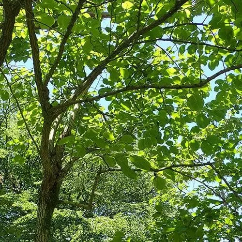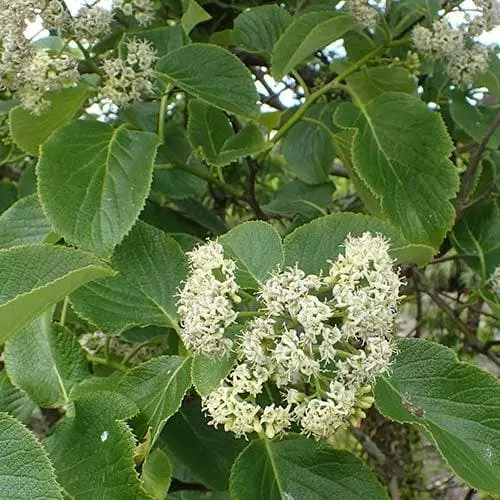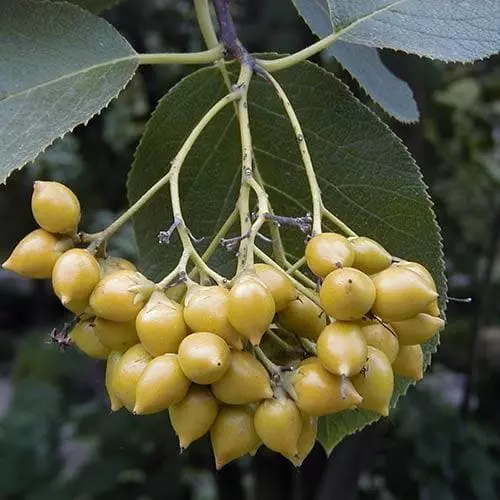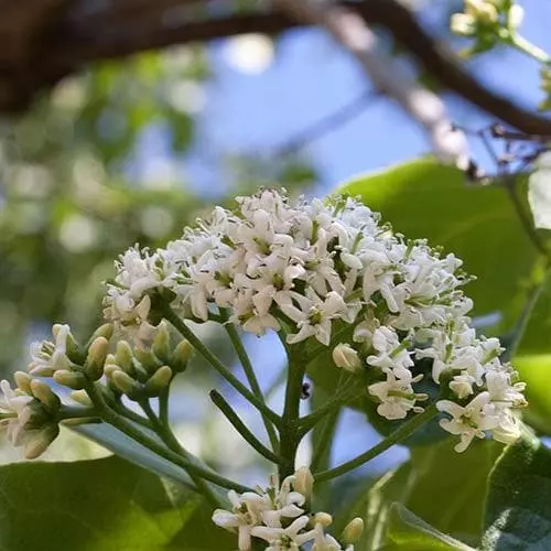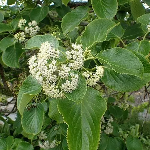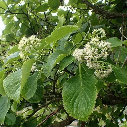 A rare and most unusual large shrub or medium-sized tree, Ehretia dicksonii is a medium-sized to tall, deciduous tree which can cope with very alkaline soil. The corky bark is grey and heavily ridged, and the branches grow at strange angles and intertwine. The large, pointed, leathery leaves, 8”/20cm long, are dark green, very rough on the upper surface and felted beneath. Panicles of creamy-white, not altogether pleasantly scented flowers are borne in May, clear of the leaves, followed by yellow or greenish-yellow berries. Needs a soil which is not too fertile, and full sun to ripen the new wood, which can otherwise be damaged by frost; the tree is however, perfectly hardy.