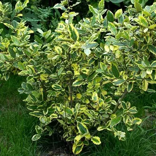 A fine, variegated oleaster, Elaeagnus pungens Goldrim is a large, often spiny, evergreen shrub with a dense, bushy habit. The glossy, elliptical leaves are deep green, with a narrow margin of golden-yellow which really lifts the appearance of the shrub. Small, beautifully fragrant, white flowers are borne in autumn, very attractive to pollinators at a time of year when nectar and pollen supplies are running low. These are followed by small brown fruits which gradually turn red. An easy shrub, and drought-tolerant once established, oleaster Goldrim can also be used for hedging, and is good on banks and slopes.