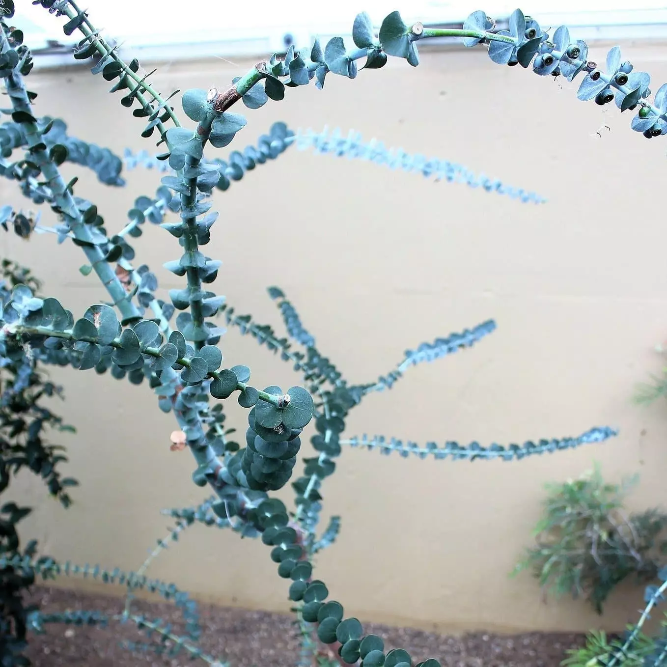 Tapped by the aboriginal inhabitants of Tasmania to make a cider-like drink, Eucalyptus gunnii is one of the hardiest eucalypts. Eucalyptus gunnii Blue Ice is a tall, fast-growing, evergreen tree with a broad, fairly dense crown and attractively spreading branches. It can also be kept coppiced to make a large shrub. The light grey bark peels away to reveal reddish patches. The round to ovate, waxy, aromatic, grey-blue juvenile foliage clasps the stems, and is much bluer than the species; it’s excellent for flower-arranging. Eventually willow-like, matte, blue-grey-green adult foliage appears, but judicious pruning can keep the juvenile foliage coming. Yellowish buds open to small white flowers, attractive to pollinators. Once established, cider gum Blue Ice can cope with drought, but also with soils that lie wet in winter. It needs to be watered well in its first year until it puts down a good root-system. Can be used for hedging.