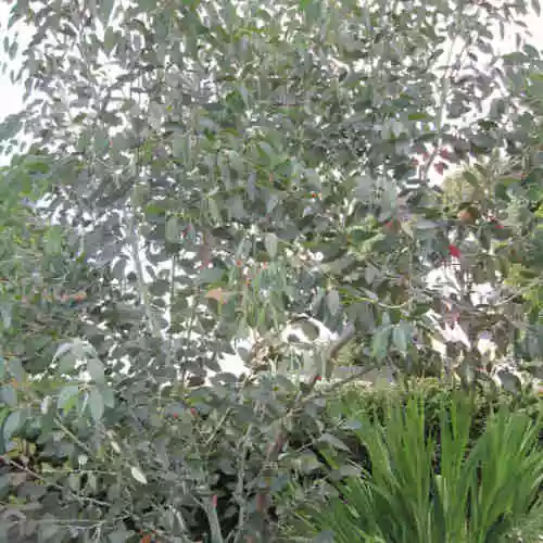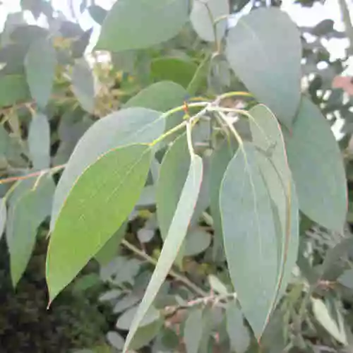 Well adapted to harsh winter conditions, although it can suffer frost damage when young, Eucalyptus pauciflora subsp. debeuzevillei is a large, evergreen tree with a rounded crown and attractive, open habit; it grows slowly at first, before growing away more vigorously. The bark is pale grey to pure white with patches of rusty red, cream and olive green, and peels attractively in long strips from the branches and trunk. Emerging shoots and leaves are coppery with a white bloom. The highly aromatic, blue-green, leathery juvenile foliage is very large and almost oblong in shape, becoming lance-shaped and olive green as the tree ages. The white flowers are attractive to bees. Jounama snow gum holds the RHS Award of Garden Merit. It can be used for a shelter belt, and like many eucalypts, will regenerate from the base if cut back by frost.