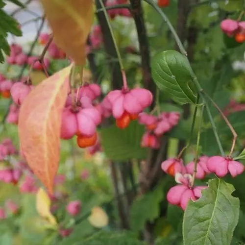 A cultivar of our native spindle-tree, Euonymus europaeus Scarlet Wonder is a medium-sized, spreading, deciduous shrub with a bushy habit, chiefly grown for its wonderful autumn colour. Narrow, oval, green leaves turn rich shades of yellow, orange and pinkish-red in autumn. The small yellow flowers are followed in autumn by the familiar shocking-pink fruits, which split open to reveal contrasting orange seeds and persist long after the leaves fall; these are an imortant food source for birds. Tolerant of all soil types, spindle Scarlet Wonder does particularly well in alkaline, even chalky, soil.