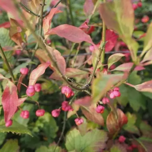 Sometimes known as Spindleberry or burning bush, Euonymus europaeus is native to Ireland. It usually grows tall and narrow, although given enough space it can reach more than 5m high and wide. Often planted as part of a hedgerow but its many cultivars are becoming common in gardens. In Summer it has tiny greenish-white flowers, in small clusters adn in Autumn it has bright pink fruit containing black seeds within orange sheaths which become exposed as the leaf turns a brilliant orange and fall.
