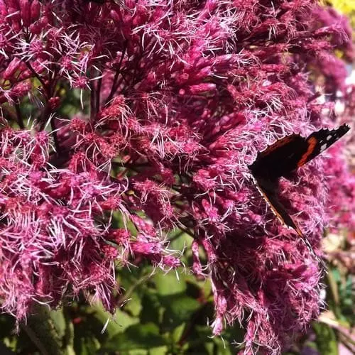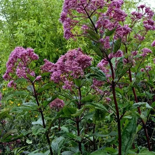 This plant sports rosy-purple heads of flowers, which are extremely attractive to butterflies and other beneficial pollinators, in late Summer. The umbrella-shaped flower clusters are followed by fluffy seedheads which continue into winter, providing food for birds. Forming a huge clump of dark green leaves with burgundy stems, Eupatorium maculatum Purpureum is quite a large, architectural plant making it suitable for the wild meadow garden or at the back of a mixed border. Looks good with grasses. Joe-Pye Weed is happiest in moist to wet soil so well at home in a bog garden or by the water’s edge. Makes good cut flowers, too.