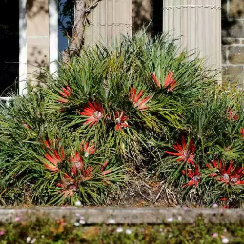 A terrestrial bromeliad, forming rosettes of slender, rigid, spiny-toothed leaves. Towards the end of Summer the bases of the leaves on mature plants begin to turn red and after a few weeks most of the leaf becomes bright crimson. A bud then forms in the center of this rosette which opens into a pale-blue flower, offering a striking colour combination in the Autumn garden!