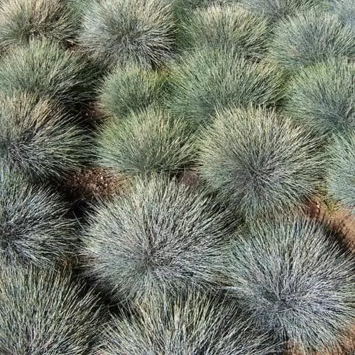 From the south of France, Festuca glauca is a small, clump-forming, evergreen, cool-season grass forming dense clumps. Arching, linear, steel-blue leaves are soft to the touch; fresh, clear blue growth appears in spring. Pretty, slender, blue flowering spikes appear in early summer; these turn hay-coloured, and can be removed to preserve the clear blue effect. Blue Fescue is an asy, low-maintenance structural plant, perfect for a minimalist planting scheme, but also lovely as a specimen, contrasting with perennial flowers, or for rockeries. Needs sharp drainage and colours best on poor soils.