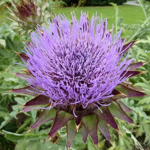 A perennial vegetable which is also a wonderfully architectural plant for a sunny border, Cynara scolymus is a statuesque, herbaceous perennial with an upright habit. The huge, jagged leaves are grey-green, at their best in spring and early summer. From May, the big, spiny buds can be cut, cooked and eaten. If left on the plant, they swell and open into wonderful purple thistle-like flowers, a magnet for pollinators; later, the seed-heads provide winter interest and are attractive to finches. A good structural plant for the back of a sunny border – but leave access to cut the delicious buds!