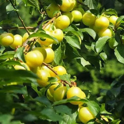 Bred in New York State in the 19th century, dessert Plum Denniston’s Superb is thought to be a true plum, but has beautiful greengage-like fruit, and is less fussy than most gages. Small, round, greenish-yellow fruit with sweet, rich, greengage flavour. Moderately vigorous, upright-spreading tree with a tendency to develop a weeping habit; reliable, heavy cropper. Attractive blossom; excellent pollinator. Self-fertile, but may crop even better if cross-pollinated. Good disease resistance, especially to canker. Also known as Imperial Gage, under which name it holds the RHS Award of Garden Merit.