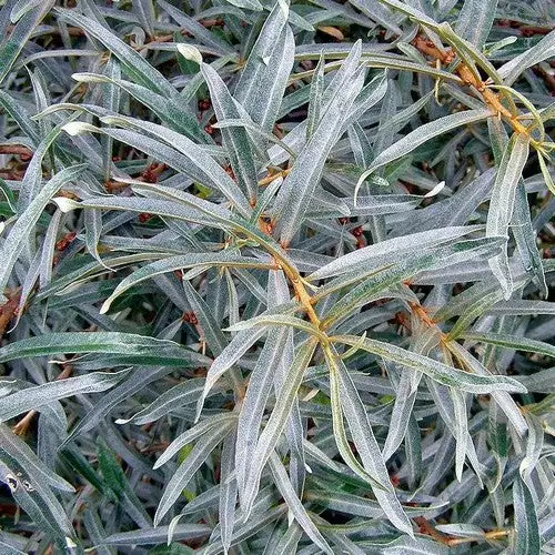 A male sea buckthorn, selected to be a pollinating partner to sea buckthorn Juliet, Hippophae rhamnoides Romeo is a large, semi-evergreen shrub of average vigour, with an upright, rounded, bushy and very thorny habit, ideally suited as a burglar- or stock-proof hedge in coastal gardens. The long, lance-shaped leaves are silvery-green. Insignificant clusters of small, whitish-yellow flowers are borne in April, before the leaves. Sea buckthorn Romeo is a low maintenance, pest-free shrub; water it well on planting and while establishing, after which it is drought-tolerant. Prune off any dead or badly-placed shoots. This plant does not produce fruit, you will need to plant a female cultivar like sea buckthorn Juliet, to get the Vitamin C-rich berries