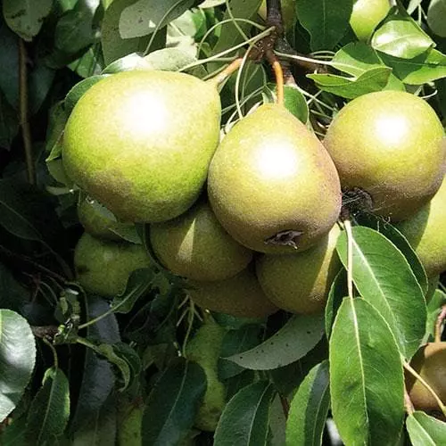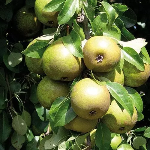 A very old, late-season, long-storing, dessert pear, Pyrus communis Winter Nelis was bred in Malines, Belgium at the beginning of the 18th century. The fruit is no beauty, but has a marvellous flavour when grown in a warm, sheltered, sunny site or, better, trained on a warm wall. The pears are small and round with a dull green skin, turning yellowish and heavily russeted when ripe, and the creamy-white flesh is fine-grained, buttery, juicy and sweet with a very rich, sweet flavour and delicious, vinous aroma when grown on a warm site. The tree is not vigorous, and has an upright, pyramidal habit; there is some resistance to scab. Pear Winter Nelis is a spur-bearer, and is a heavy and reliable cropper; fruit size will be improved with thinning. Pick the pears when they are slightly under-ripe and store in a cool shed; they will keep well into the New Year.