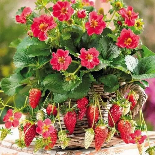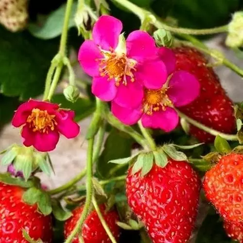 An F1 strawberry with hybrid vigour and very decorative flowers, Fragaria x ananassa Toscana has a trailing habit which makes it ideal for growing in hanging baskets or on balconies where space is limited, although it can also be grown in conventional beds. The flowers are a beautiful deep rose-pink. The fruit is mid-sized and conical, and a lovely bright red; it is very high in Vitamin C. Strawberry Toscana is an ever-bearing strawberry; instead of producing one enormous crop at midsummer it gives lighter crops for a much longer season. Easy to grow.