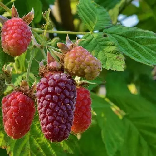 A hybrid between a raspberry and a blackberry, perhaps the best and easiest of the hybrid berries, although not suitable for the coldest areas. Tayberries are very vigorous, consistent growers and reliable, heavy croppers. Fruits on 2nd year wood, so they should ideally be grown like summer raspberries, on wire supports- but can also be trained against a wall. The juicy, aromatic, deep purple fruit looks and tastes rather like a loganberry, but is larger and sweeter. Rich in vitamins, fibre and antioxidants. Pick as they ripen, over several weeks. A good choice if you only have room for one hybrid berry.