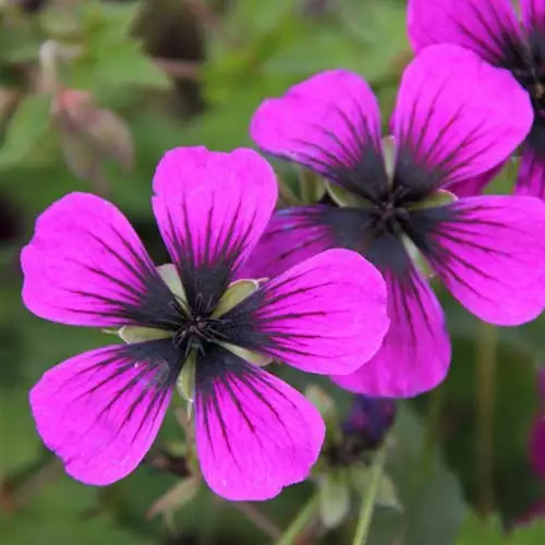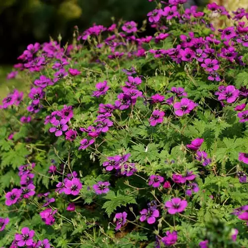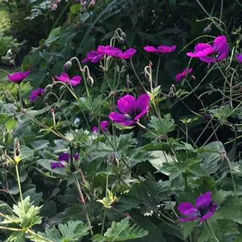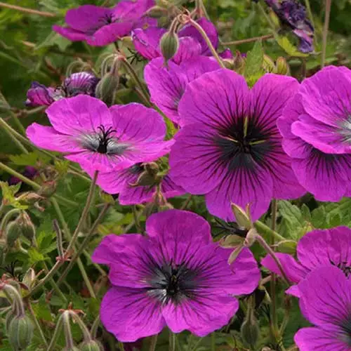 A low-growing, long-flowering cranesbill with larger flowers than most, Geranium Dragonheart (AKA Bremdra) is a herbaceous perennial with a clump-forming, rambling habit. The pretty, mid-green leaves are deeply cut, and form a spreading, weed-suppressing mat which will wind its way round and even climb into neighbouring plants – beautiful round the feet of roses. From June to September, and even into October, masses of big magenta flowers with a black ‘eye’ rise on slender stems above the clump, and are good for bees and butterflies. Geranium Dragonheart is easy to grow; as with all hardy cranesbills, when the first flush of flowers is over, cut back to the base for fresh leaves and more flowers.