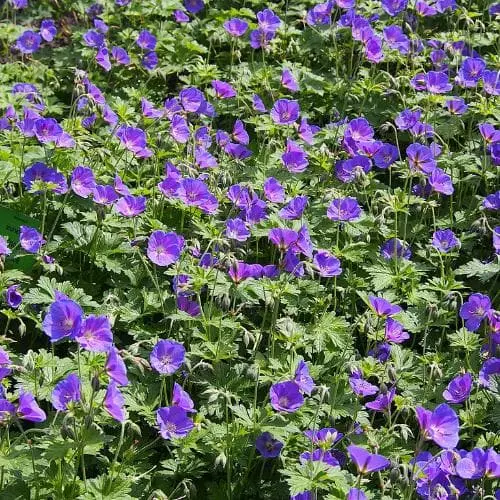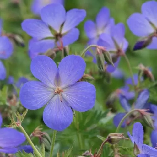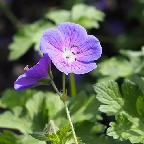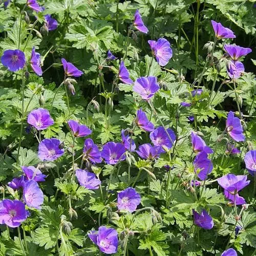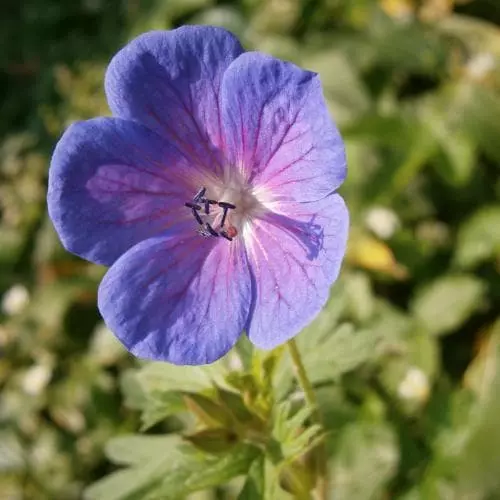 A old, much loved, hybrid cranesbill, Geranium x johnsonii Johnson’s Blue is a herbaceous, clump-forming perennial with deeply divided mid-green leaves, faintly washed with silver, a lovely foil for the flowers. Single, lavender-blue flowers with darker veins, 2”/5cm wide, are borne throughout summer; they are very attractive to bees. Hardy geranium Johnson’s Blue spreads by means of rhizomes, and makes dense ground cover; it looks particularly lovely as an underplanting for roses.