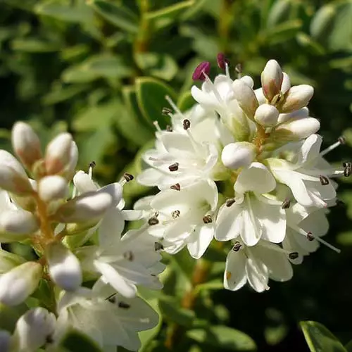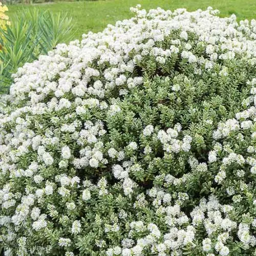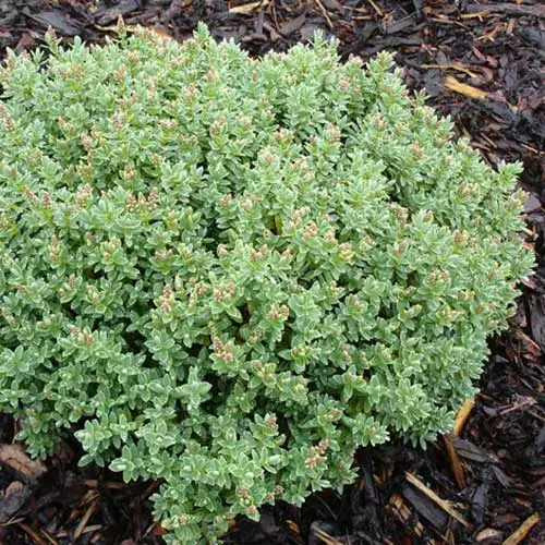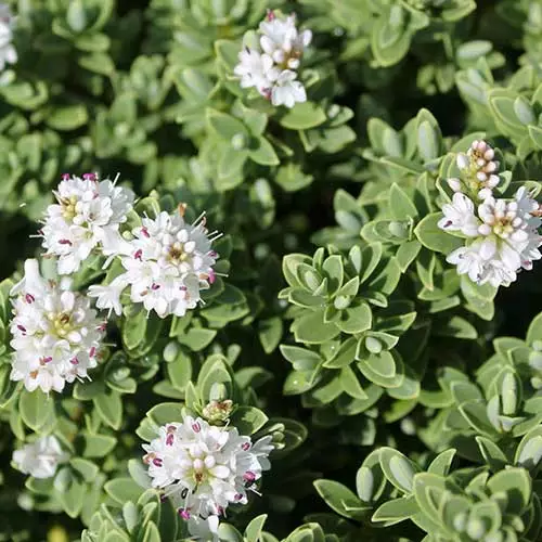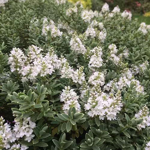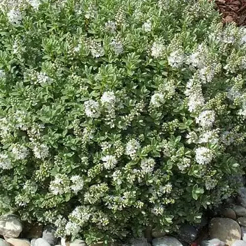 A dwarf variety of shrubby veronica ideal for the smaller garden in milder areas, Hebe pinguifolia Sutherlandii is a small, evergreen sub-shrub with a low, mound-forming habit, denser and rounder than that of Hebe pinguifolia Pagei. Small, lustrous, silvery-green leaves give year-round, ground-covering interest. In May and June, and continuing through summer, pretty spikes of tiny white flowers are a magnet for bees and butterflies. Shrubby veronica Sutherlandii is easy to grow, requiring little pruning, and will thrive in a container.