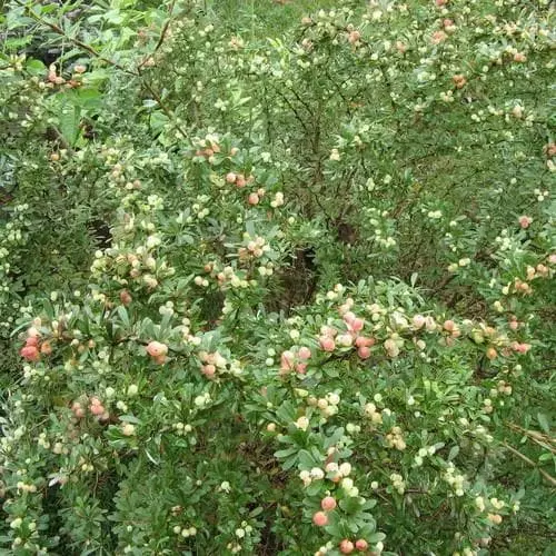 A semi-evergreen, compact rounded shrub with arching thorny branches and grey-green leaves. Pale yellow flowers come in Spring and are followed by coral-pink berries. Good autumn colours. Deer resistant.